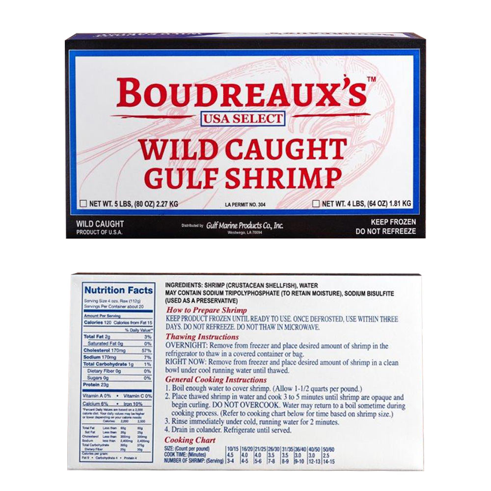 Peeled, deveined or undeveined. Boudreaux’s™ gulf shrimp is wild caught by Louisiana day boat shrimpers in the Gulf of Mexico. The shrimp is processed and frozen within hours of being caught, guaranteeing its freshness.